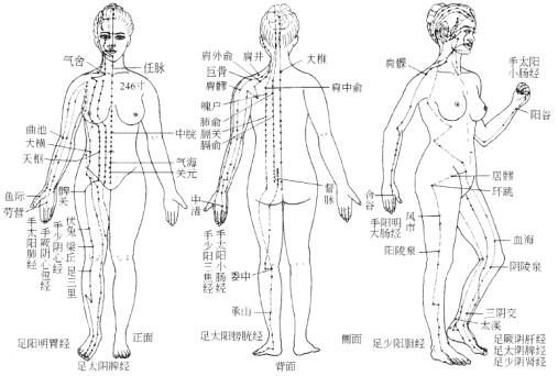 《黄帝内经》的问世,标志着经络学说的形成。《内经》中系统地论述了十二经脉的循行部位、属络脏腑,以及十二经脉发生病变时的证候;记载了十二经别、别络、经筋、皮部等的内容;对奇经八脉也有分散的论述;并且记载了约160个穴位的名称(全身主要经络穴位图4-5)。