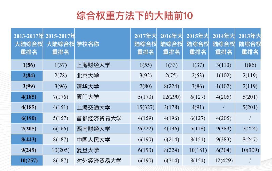 最新出炉的排名报告,采取了期刊+作者综合权重、期刊权重、作者权重和无任何权重四种方法分别进行了排名。结果显示,上海财经大学在以上四种方法下,都居于全球前60名,在国内处于顶尖水平,凸显了上海财大理论经济学跻身上海市高峰Ⅱ类学科建设计划而取得的阶段性成果。同时,近三年排名情况显示,上海财经大学在以上四种方法下,始终位居大陆高校第1,北京大学、清华大学分别位居第2和第3。此外,首都经济贸易大学、中国人民大学、复旦大学等大陆高校排名也稳中有升。