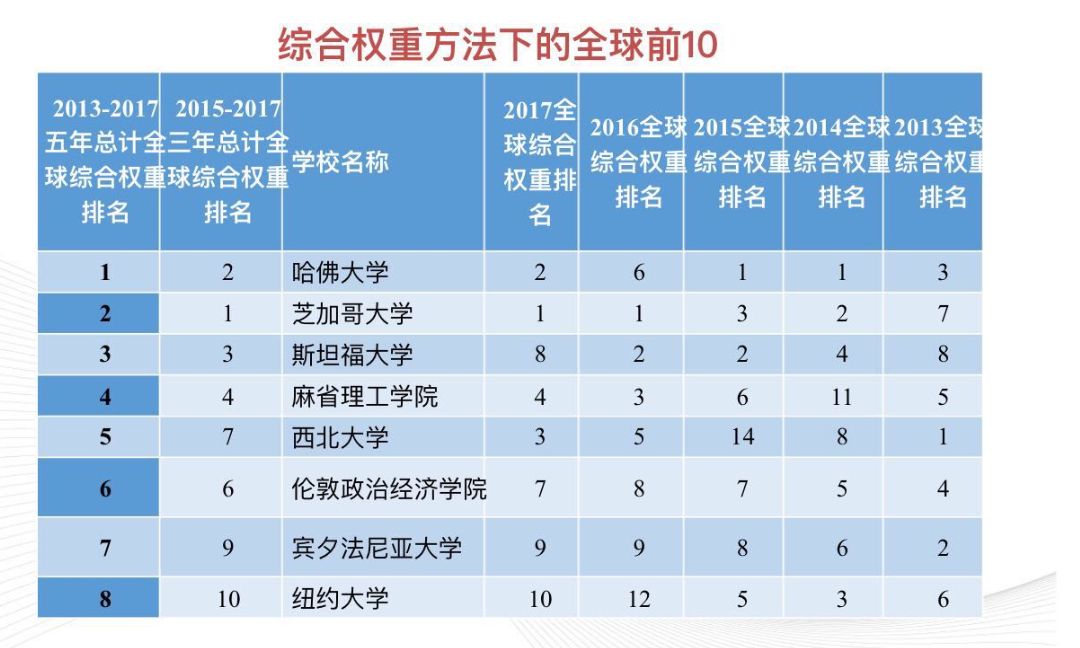 田国强介绍,此次的排名报告还新增了上一年论文发表数据,并对排名做了近五年和近三年的滚动更新。以2013-2017年的全球总体排名结果看,前10名的大学,在以上四种方法下都是前10名,尽管一些具体的名次会有变化。在前20名的大学名单中,有19所大学在四种方法下都进入前20名。按近5年和近3年的综合权重排名看,全球前3名高校仍然是哈佛大学、芝加哥大学、麻省理工学院。